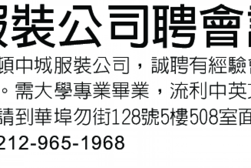 服裝公司聘會計 212-965-1968
