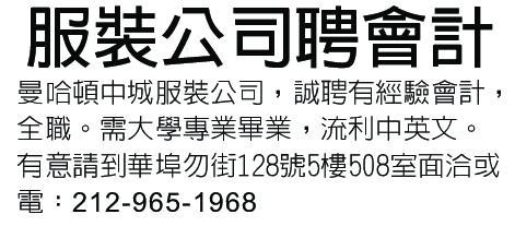 曼哈頓中城服裝公司,誠聘有經驗會計,全職。需大學專業畢業,流利中英文。有意請到華埠勿街128號5樓508室面洽或電:212-965-1968