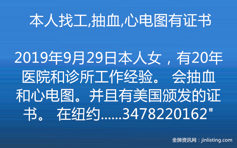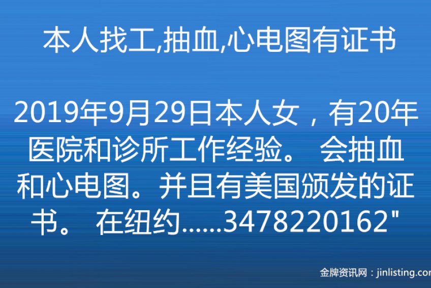 本人找工,抽血,心电图有证书。 “本人女,有20年医院和诊所工作经验。 会抽血和心电图。并且有美国颁发的证书。 在纽约地区,想找一份诊所或者医院的工作。 电话3478220162”