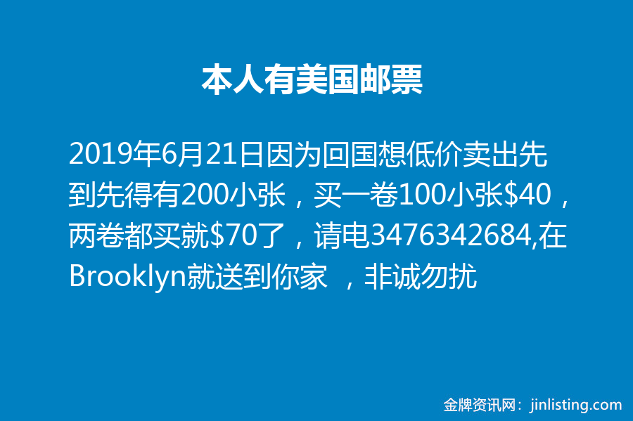 本人有美国邮票因为回国想低价卖出先到先得有200小张,买一卷100小张$40,两卷都买就$70了,请电3476342684,在Brooklyn就送到你家 ,非诚勿扰
