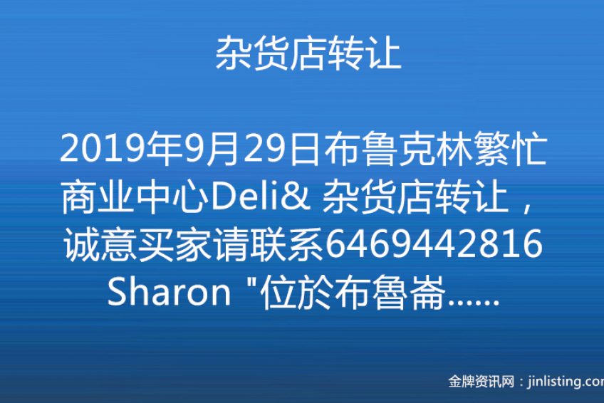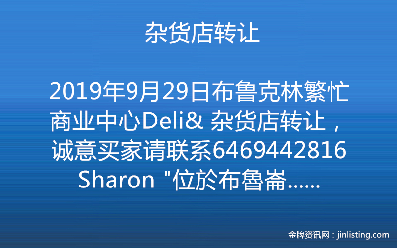 布鲁克林繁忙商业中心Deli& 杂货店转让,诚意买家请联系6469442816Sharon “位於布魯崙 最熱鬧繁華商業街。门口公车站 近地鐵 店面1800呎 +(地下室1500尺) 杂货年营70万 +六合彩年营92万 租金$5300租約7+5年 20年老店 生意穩定 售29万9 有意者請電6469442816”