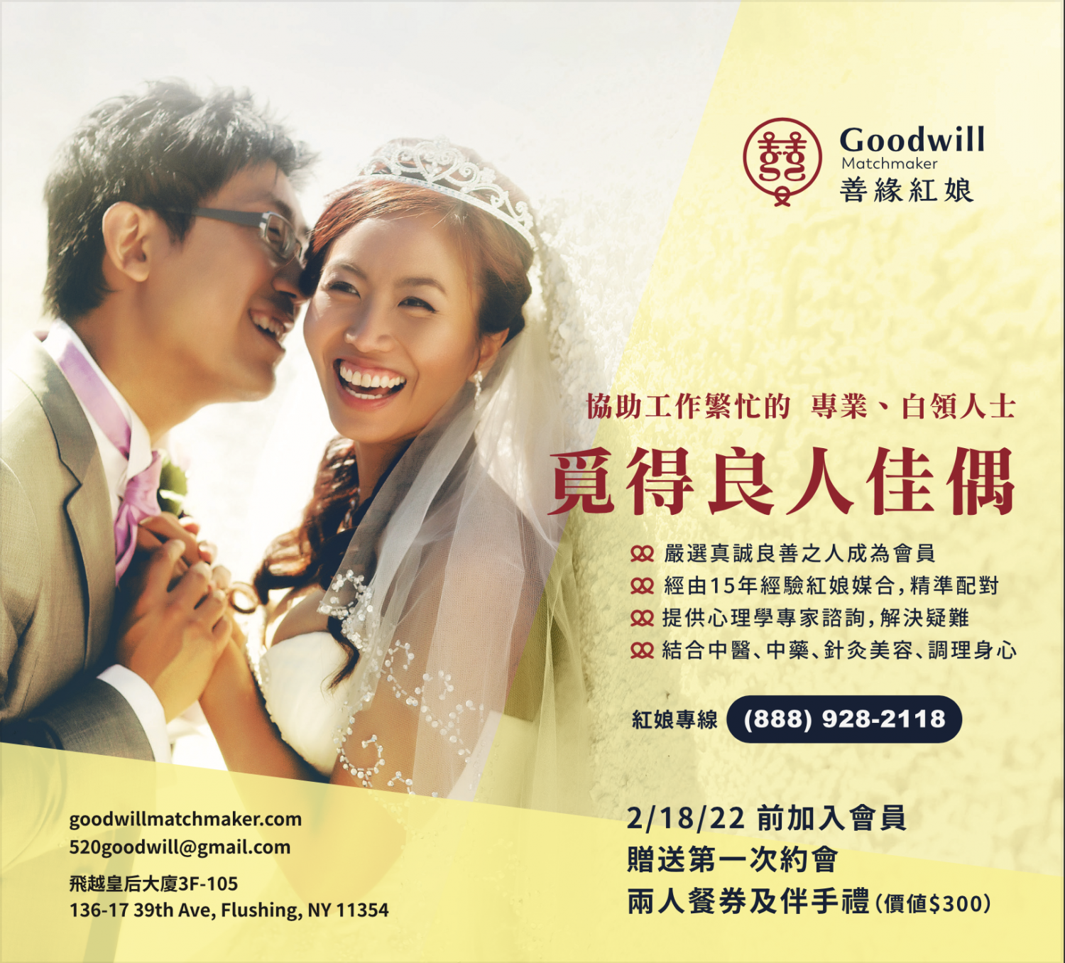 創辦人發現多年來,在紐約的華人,由於生活節奏與環境壓力,越來越多人沒有時間與機會,找到合適的交往結婚對象。尤其近兩年適逢COVID-19對全球造成的極大混亂與傷害,更是讓人心惶惶,大大減少人與人之間的交流互動。在如此時空環境下,更激起創辦人打造一個持善念,結善緣的高品質婚介所。欲讓紐約單身華人男女,藉由Goodwill Matchmaker的媒合,彼此結緣結婚,相守一輩子。
