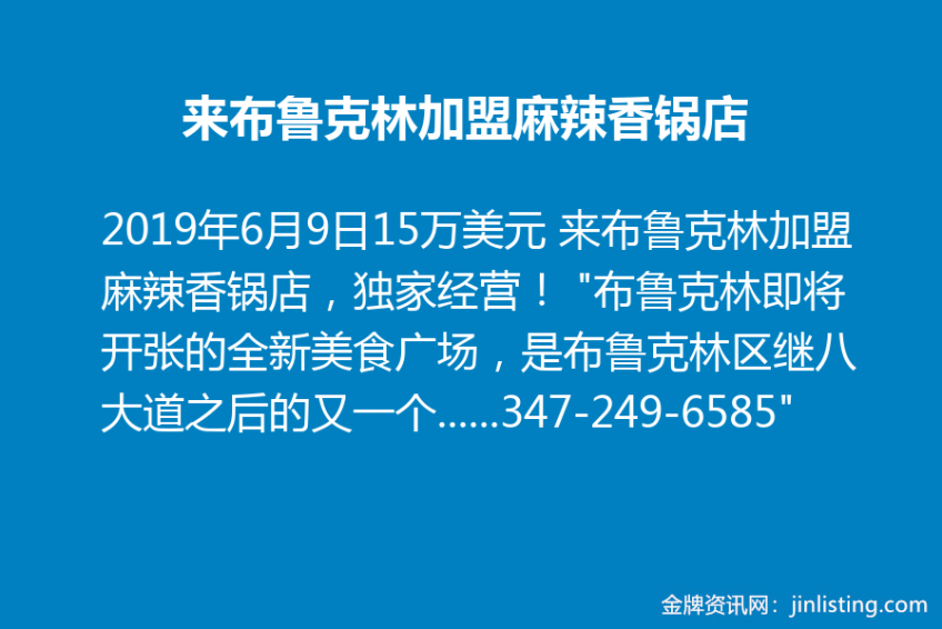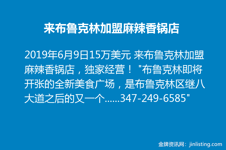 15万美元 来布鲁克林加盟麻辣香锅店,独家经营! “布鲁克林即将开张的全新美食广场,是布鲁克林区继八大道之后的又一个新兴华人聚集区。 “老妈”麻辣香锅连锁店,已经率先拿到了独家经营权,意味着开业后,全场只有1家“老妈”麻辣香锅和麻辣烫小吃允许经营,在竞争的起跑线上,我们已经领先了一步! “老妈”麻辣香锅的酱料不可复制,味道独特,吃过的都会留下一种无法忘记的味道,在曼哈顿,法拉盛,新泽西,华盛顿等地都颇受大家欢迎。 现决定,“老妈”麻辣香锅(布鲁克林店)也将拿出做为加盟店来经营,投资金额并不高,回本很快,欢迎各位有兴趣,有发展眼光的朋友,来电咨询! 咨询电话:347-249-6585”