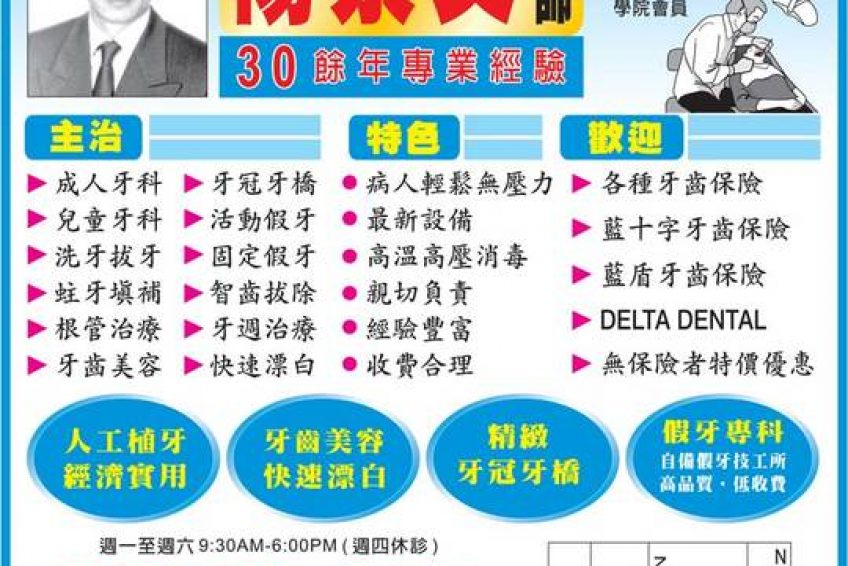 歡迎:各種牙齒保險丶政府醫療卡丶MFDI-CAL丶DELTA DENTAL丶HEALTHY FAMILIES丶無保險特別優惠