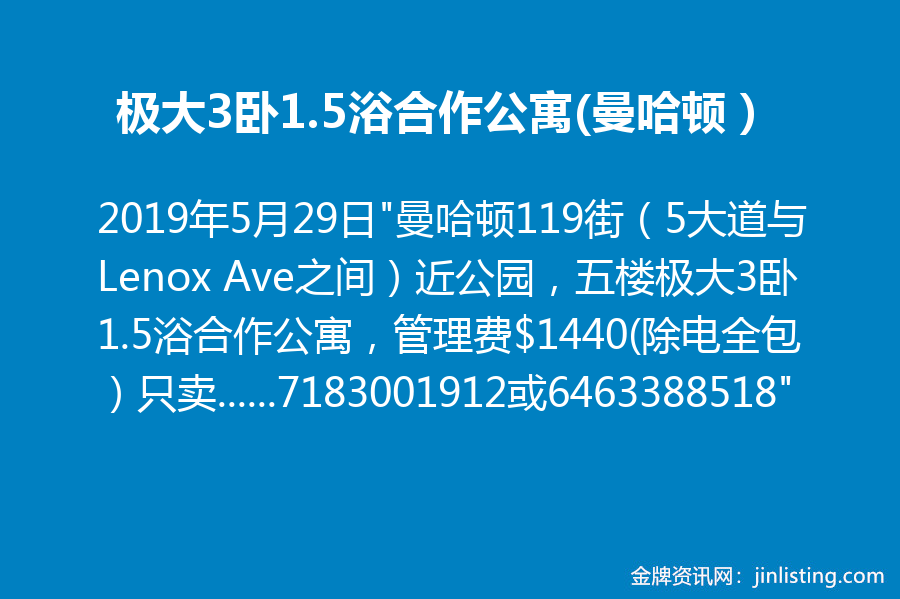极大3卧1.5浴合作公寓(曼哈顿) “曼哈顿119街(5大道与Lenox Ave之间)近公园,五楼极大3卧1.5浴合作公寓,管理费$1440(除电全包)只卖$50万! 看房从速,请电或短信何亨利团队7183001912或6463388518”