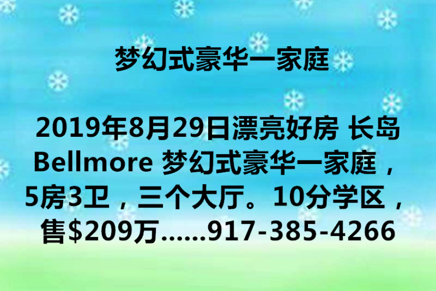 漂亮好房 长岛Bellmore 梦幻式豪华一家庭,5房3卫,三个大厅。10分学区,售$209万,地80X190,室内面积6900尺,地税$32301,自动中央吸尘系统,中央空调,高ceiling 地暖,私人游泳池,私人全新码头,12年新的豪华装修。电话917-385-4266