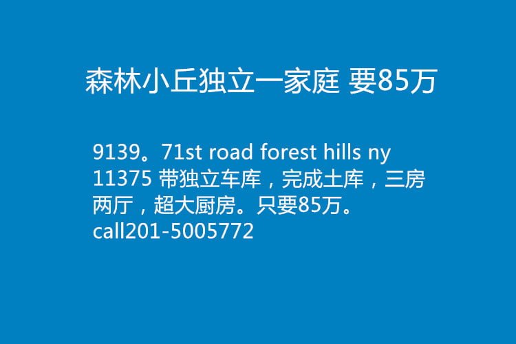 森林小丘独立一家庭,9139。71st road forest hills ny 11375 带独立车库,完成土库,三房两厅,超大厨房。只要85万。call201-5005772