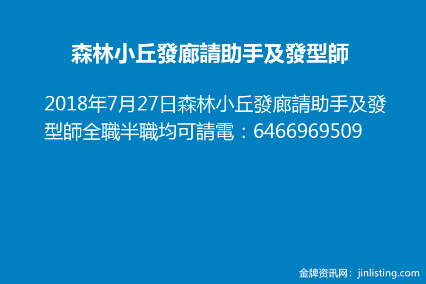 森林小丘發廊請助手及發型師646-696-9509