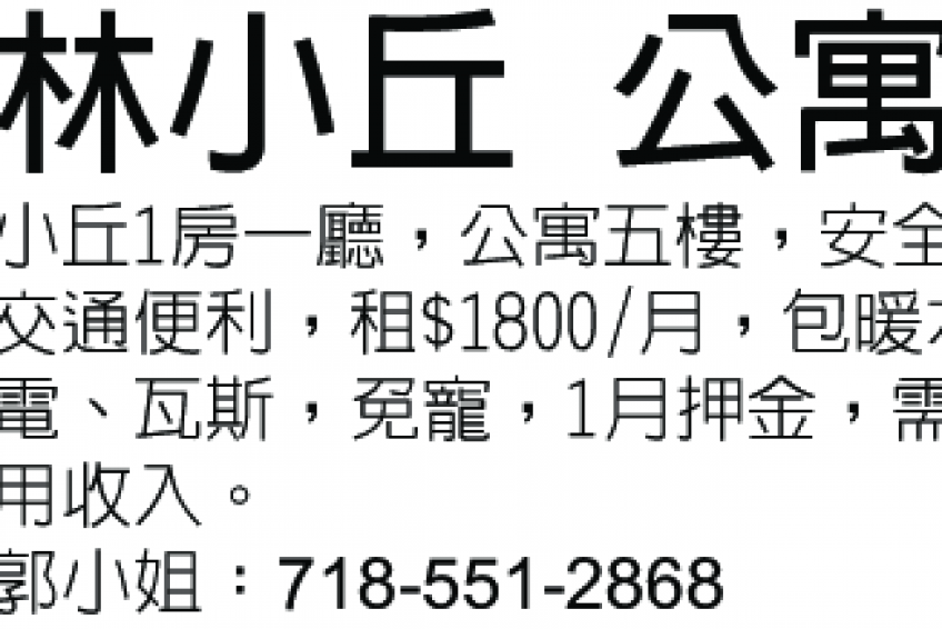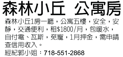 森林小丘1房1廳 ,公寓5樓,安全安静,交通便利, 租$1800/月,包暖水, 自付电、瓦斯,免寵,1月押金,需申请,查信用 收入 經紀郭小姐 718-551-2868