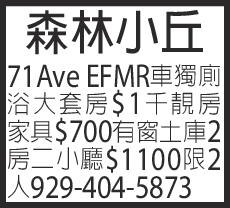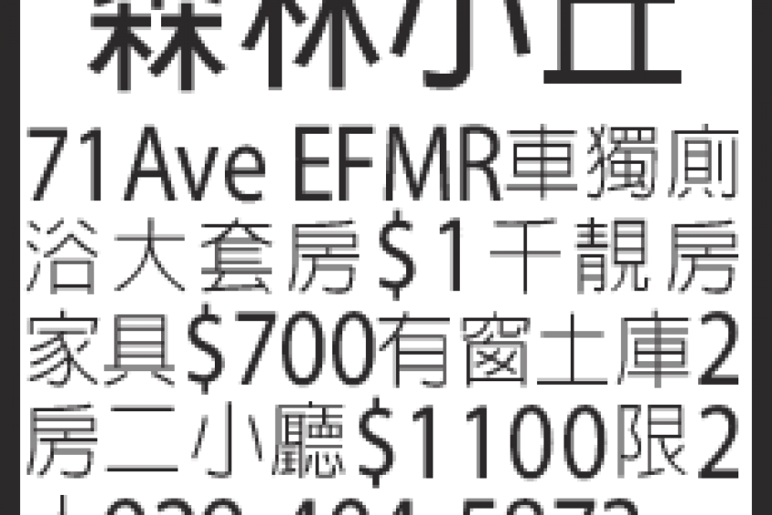 森林小丘71Ave EFMR車 美屋獨廁浴大套房1千,靚房有家具$700 有窗土庫2房2小廳$1100限2人