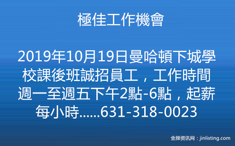 曼哈頓下城學校課後班誠招員工,工作時間週一至週五下午2點-6點,起薪每小時$ 15,另加地鐵票,工作穩定。需合法工作身份,講國語和基本英語,誠實 ,有責任心,有5年以上工作(職業不限)經歷者優先。有意請電話或短信:631-318-0023