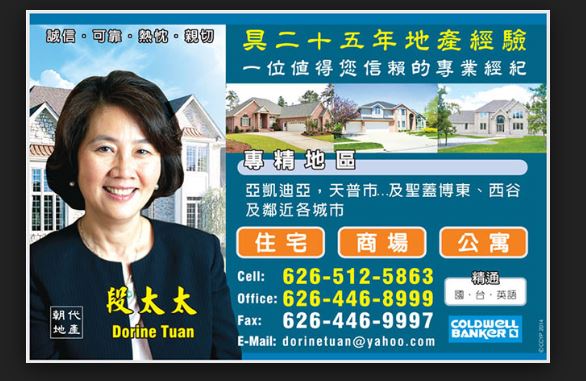 段太太一直是Coldwell Banker Dynasty 朝代地产最优秀的房地产经纪,拥有25 年的房地产经验,并且一直是顶尖的销售冠军。