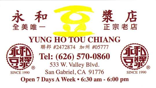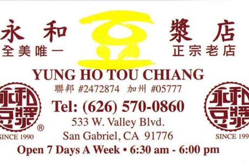 永和豆漿 – YUNG HO TOUCHIANG RESTAURANT 註冊公司名稱:YUNG HO TOUCHIANG 早點,面點,小吃 626-570-0860 簡單介紹 豆漿,燒瓶,油條,甜鹹豆花,蛋餅,飯團,素菜肉包,鍋貼小籠包,羊肉米粉,牛肉面, Open 7 days a week 6:30 am – 6:00 pm.