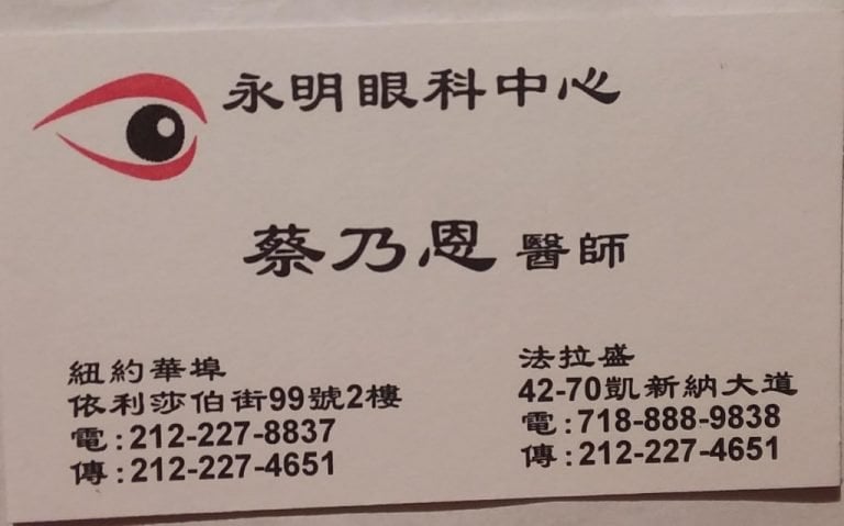 永明眼科中 紐約華卑 蔡乃恩 醫師 依利莎伯街99號2樓 電:212_227_8837 傅:212_227-4 … 继续阅读永明眼科中-永明眼科中-212_227_8837