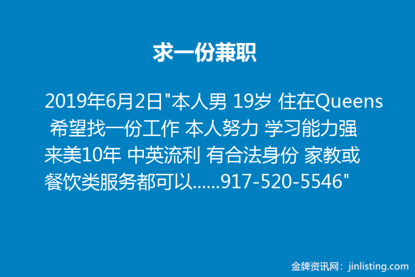 求一份兼职 “本人男 19岁 住在Queens 希望找一份工作 本人努力 学习能力强 来美10年 中英流利 有合法身份 家教或餐饮类服务都可以 只能做兼职 因为还在上学 有需要的老板请联系我 电话:917-520-5546”