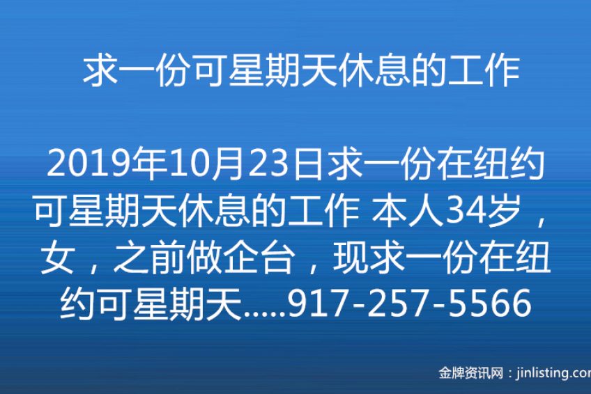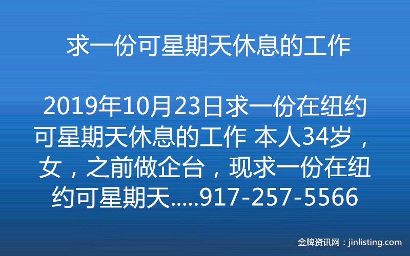 求一份在纽约可星期天休息的工作 本人34岁,女,之前做企台,现求一份在纽约可星期天休息的工作,电话917-257-5566