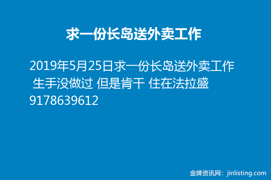 求一份长岛送外卖工作 生手没做过 但是肯干 住在法拉盛 9178639612