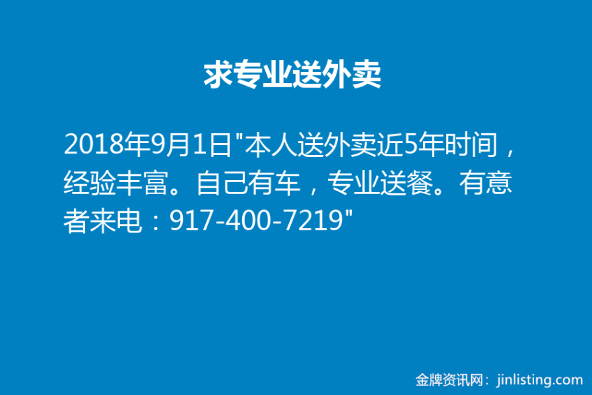 自己有车,专业送餐。有意者来电:917-400-7219”