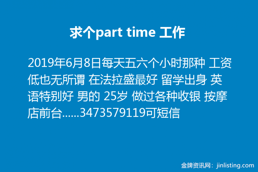“求个part time 工作 每天五六个小时那种 工资低也无所谓 在法拉盛最好 留学出身 英语特别好 男的 25岁 做过各种收银 按摩店前台 批发公司文员 3473579119可短信 微信812014375”