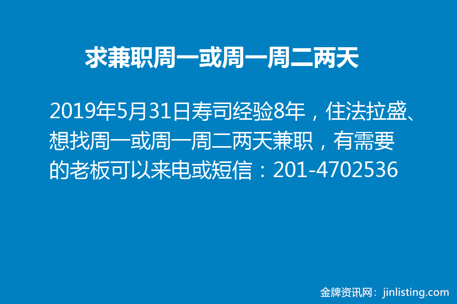 求兼职周一或周一周二两天 寿司经验8年,住法拉盛、想找周一或周一周二两天兼职,有需要的老板可以来电或短信:201-4702536