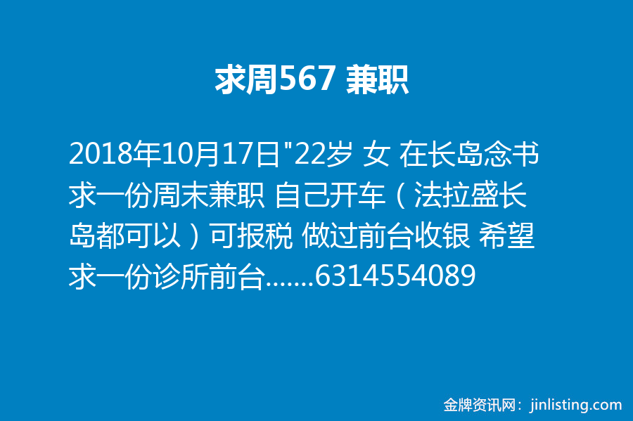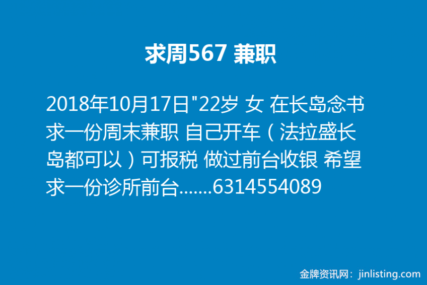 “22岁 女 在长岛念书 求一份周末兼职 自己开车(法拉盛长岛都可以)
