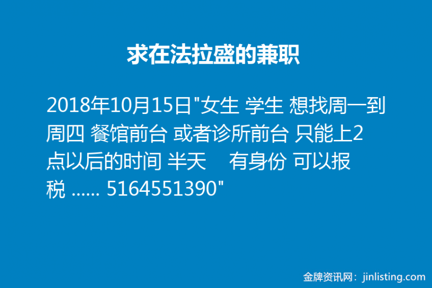 “女生 学生 想找周一到周四 餐馆前台 或者诊所前台 只能上2点以后的时间 半天