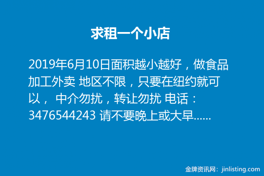 “求租一个小店,面积越小越好,做食品加工外卖 地区不限,只要在纽约就可以, 中介勿扰,转让勿扰 电话:3476544243 请不要晚上或大早上打电话,谢谢”