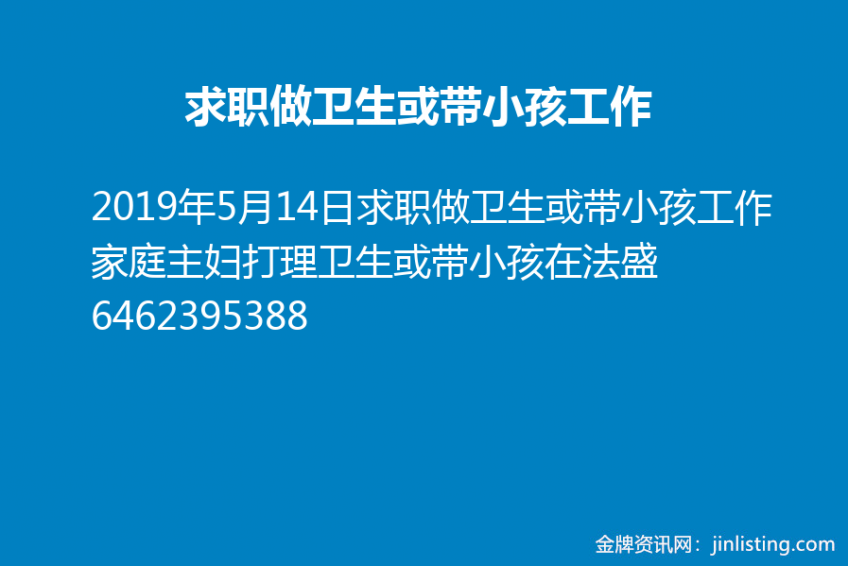 求职做卫生或带小孩工作 家庭主妇打理卫生或带小孩在法盛6462395388