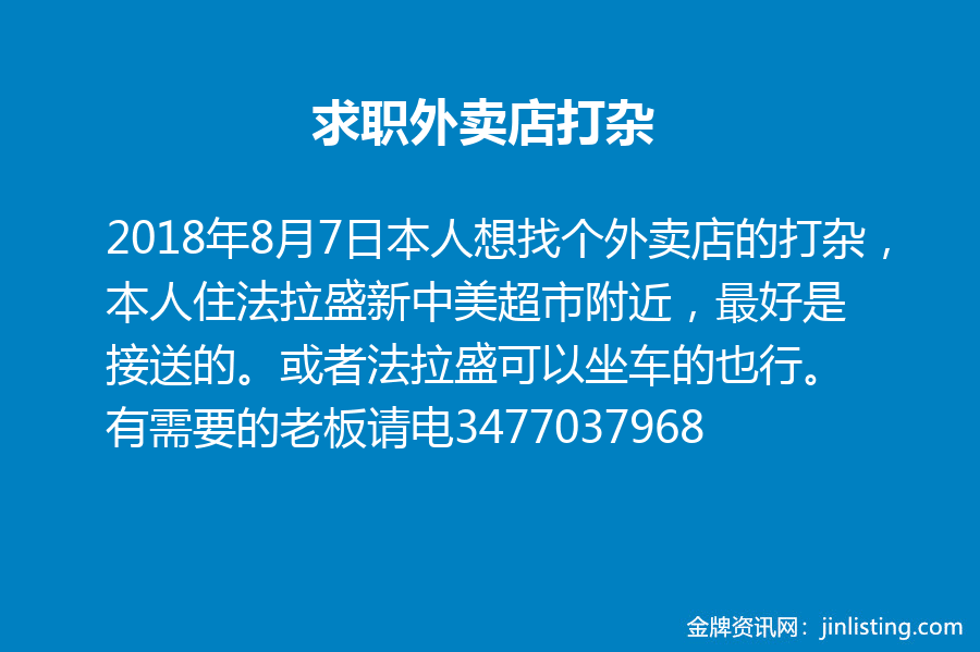 本人想找个外卖店的打杂,本人住法拉盛新中美超市附近,最好是接送的。或者法拉盛可以坐车的也行。有需要的老板请电3477037968没接可短信,或者加微信也行236024222。谢谢了!