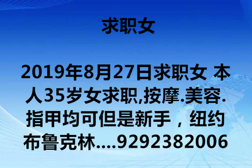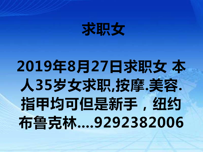 求职女 本人35岁女求职,按摩.美容.指甲均可但是新手,纽约布鲁克林附近均可不去外州电话9292382006