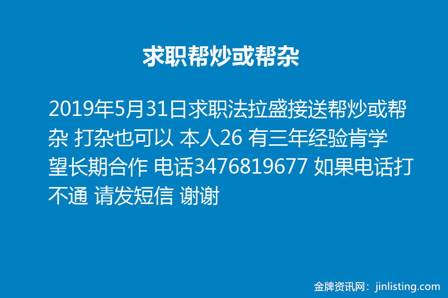 求职帮炒或帮杂 求职法拉盛接送帮炒或帮杂 打杂也可以 本人26 有三年经验 肯学 望长期合作 电话3476819677 如果电话打不通 请发短信 谢谢