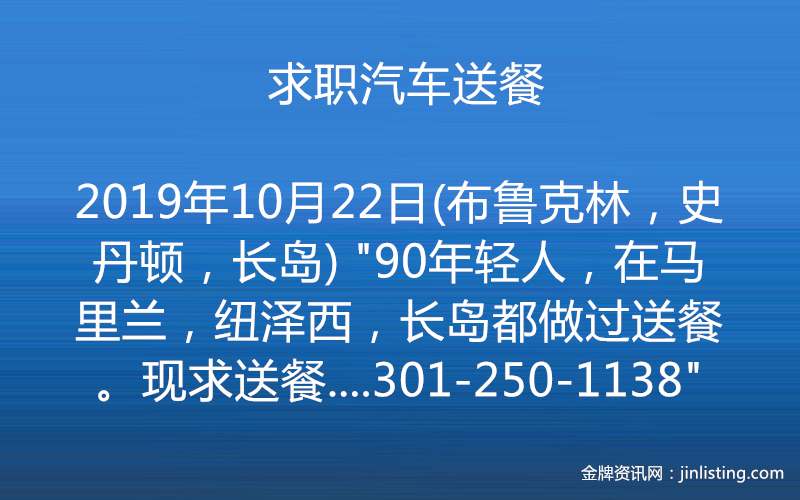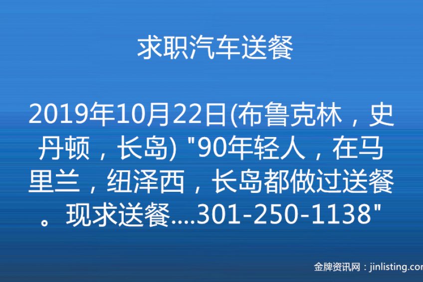 求职汽车送餐(布鲁克林,史丹顿,长岛) “90年轻人,在马里兰,纽泽西,长岛都做过送餐。现求送餐工作~有需要的联系~ 301-250-1138”