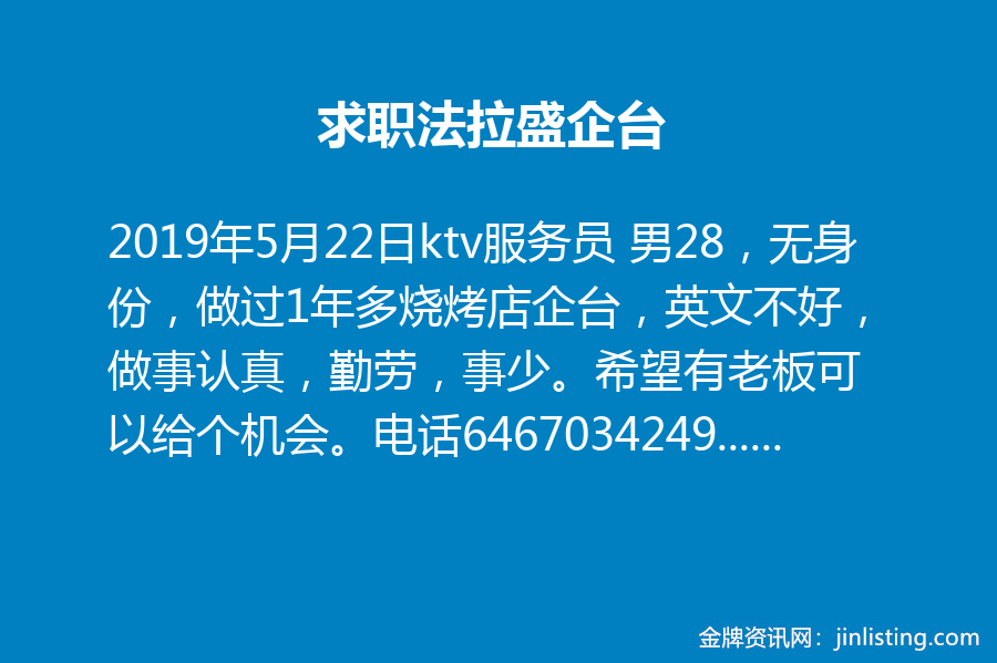 求职法拉盛企台,ktv服务员 男28,无身份,做过1年多烧烤店企台,英文不好,做事认真,勤劳,事少。希望有老板可以给个机会。电话6467034249。如未接,希望可以发条短信。谢谢。