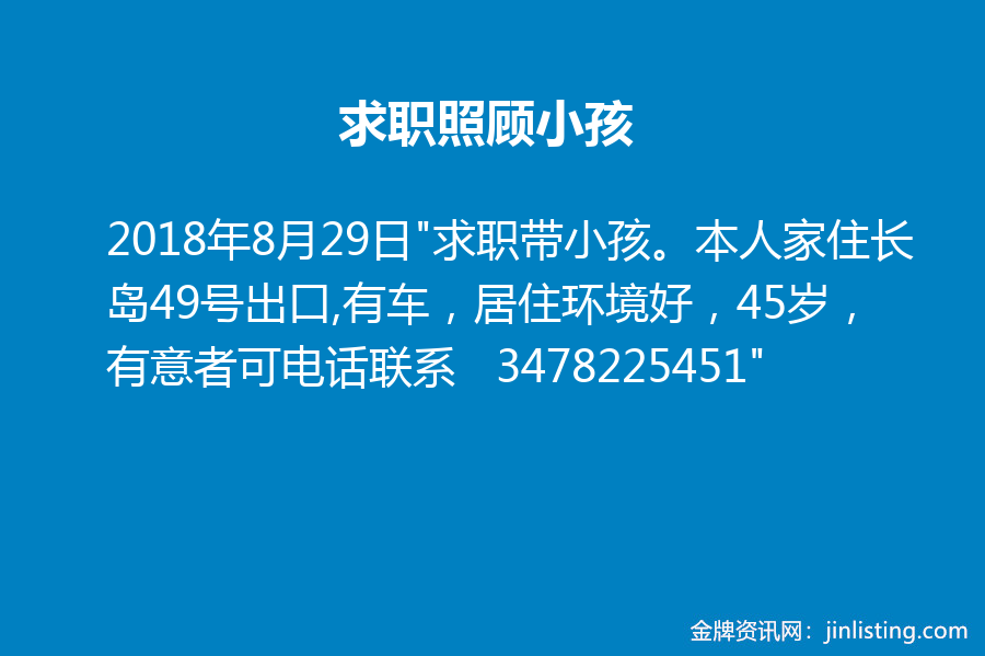 “求职带小孩。本人家住长岛49号出口,有车,居住环境好,45岁,有意者可电话联系