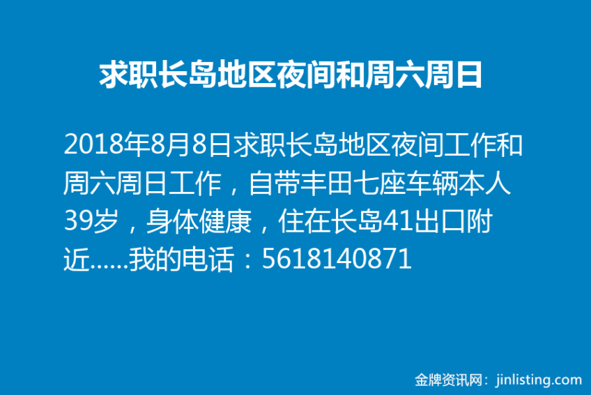 本人39岁,身体健康,住在长岛41出口附近,求职夜间6:00以后或周六周日全天的工作,自带丰田七座车辆,人员接送、包车、维修装修类、业务宣传类、绿化类送货类工作都可以,我的电话:5618140871(电话忙时请短信) 微信:BR757N,谢谢。