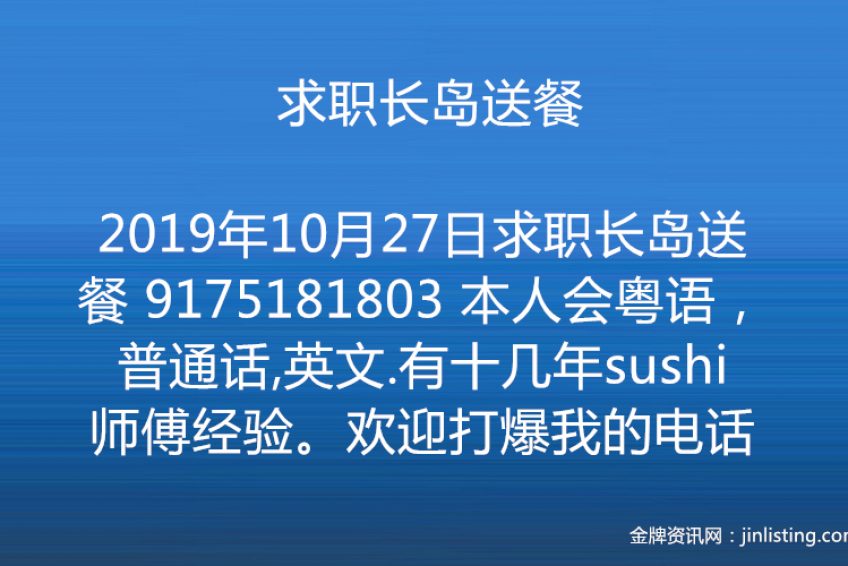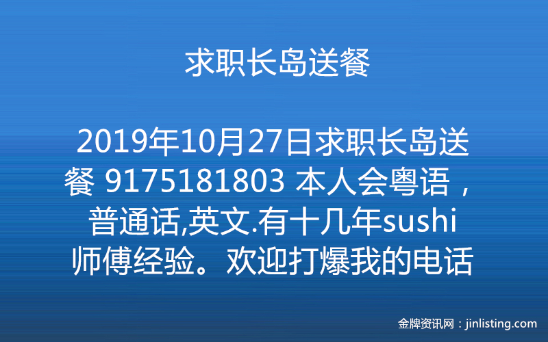 求职长岛送餐 9175181803 本人会粤语,普通话,英文.有十几年sushi 师傅经验。欢迎打爆我的电话
