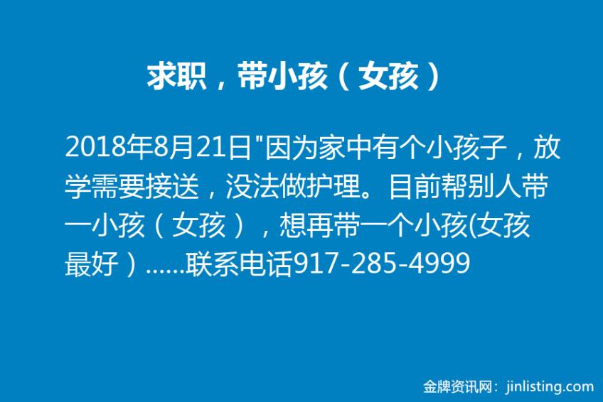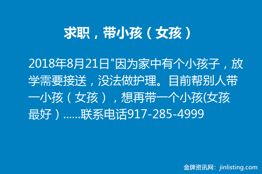 “因为家中有个小孩子,放学需要接送,没法做护理。目前帮别人带一小孩(女孩),想再带一个小孩(女孩最好),早上过来,下午回家的那种,价格可以面谈。