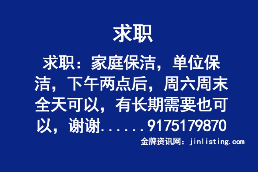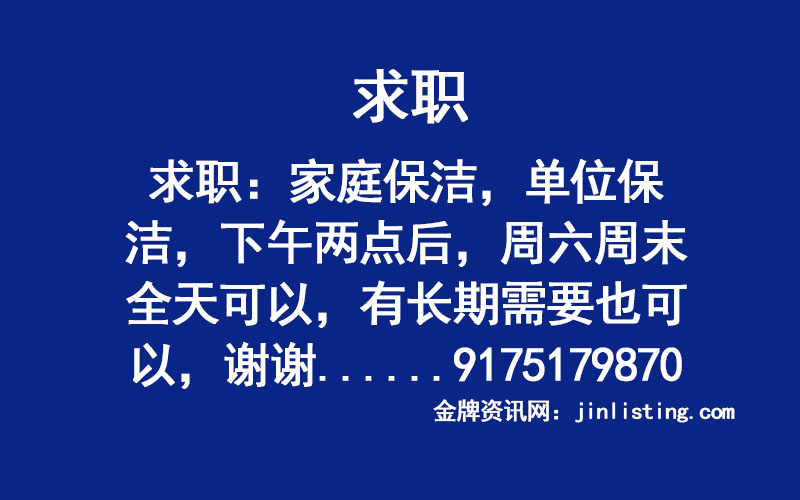 求职::家庭保洁,单位保洁,下午两点后,周六周末全天可以,有长期需要也可以,谢谢!联系电话9175179870