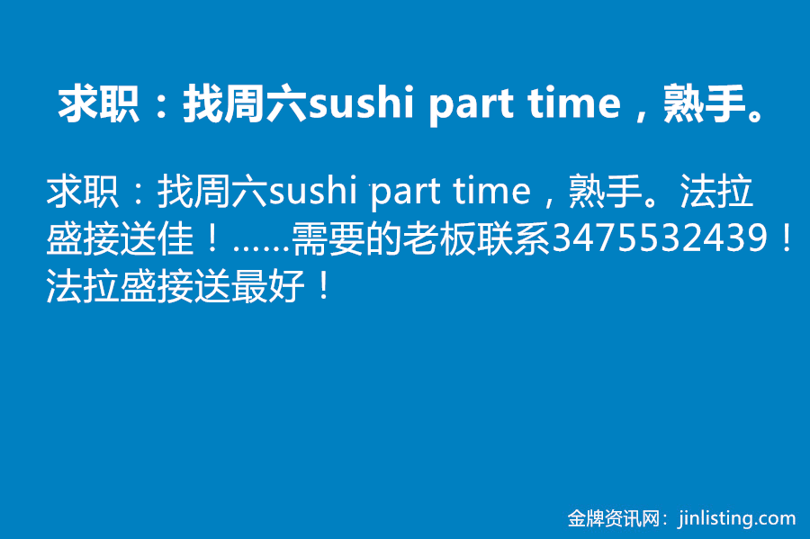 求职:找周六sushi part time,熟手。法拉盛接送佳!找固定的周六sushi part time工,长期合作。年轻人不墨迹不计较。需要的老板联系3475532439!法拉盛接送最好!