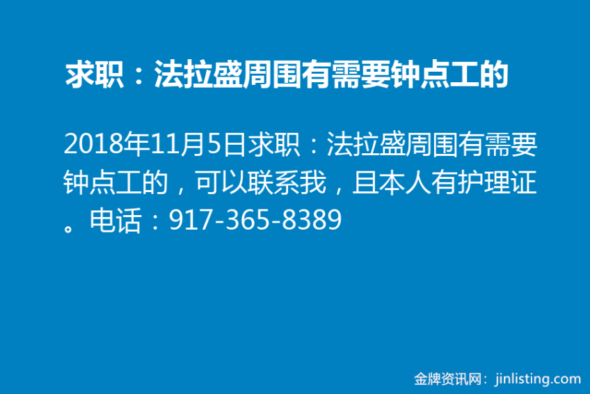 求职:法拉盛周围有需要钟点工的,可以联系我,且本人有护理证。电话:917-365-8389