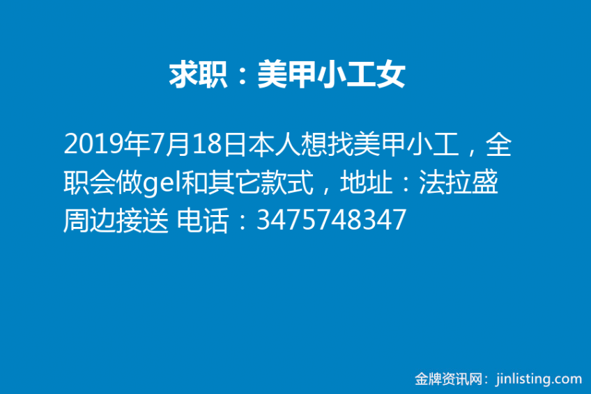 求职:美甲小工女 本人想找美甲小工,全职会做gel和其它款式,地址:法拉盛周边接送 电话:3475748347