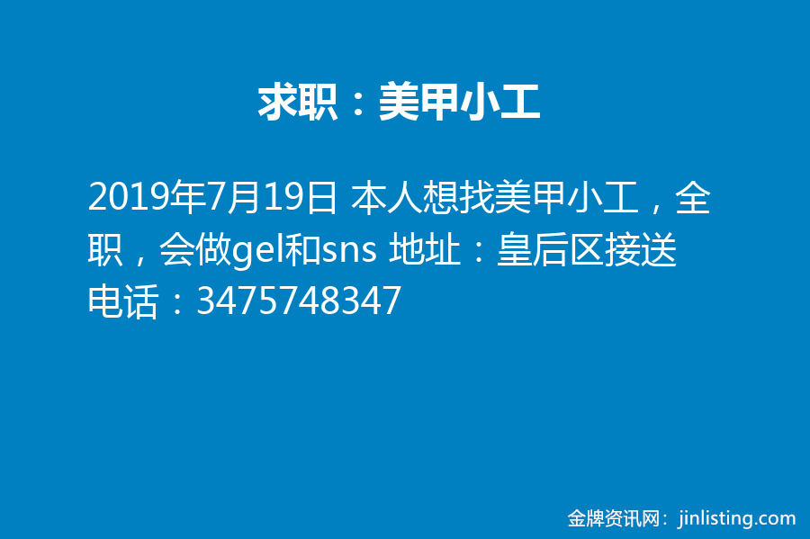 求职:美甲小工 本人想找美甲小工,全职,会做gel和sns 地址:皇后区接送 电话:3475748347