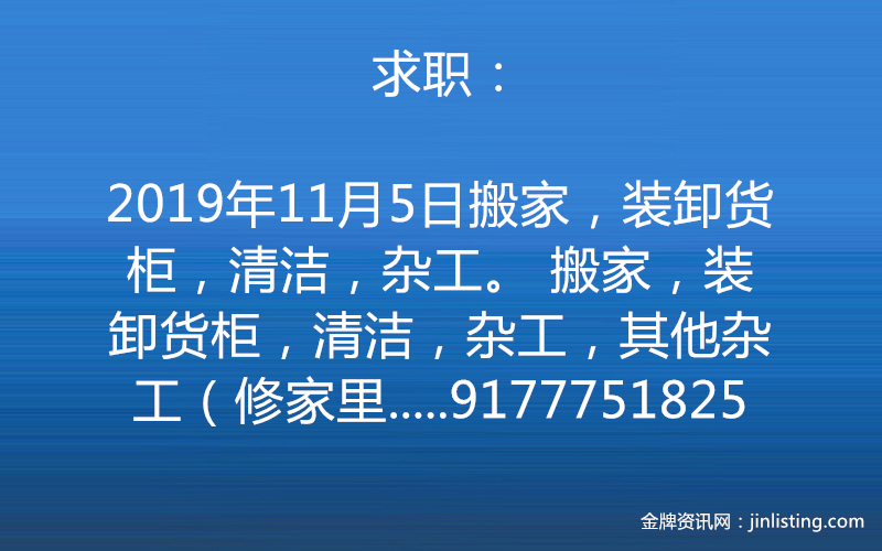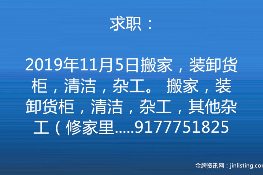 求职:搬家,装卸货柜,清洁,杂工。 搬家,装卸货柜,清洁,杂工,其他杂工(修家里水管,补墙……)有需要的老板请打电话:9177751825。谢谢,住绵街中国银行。