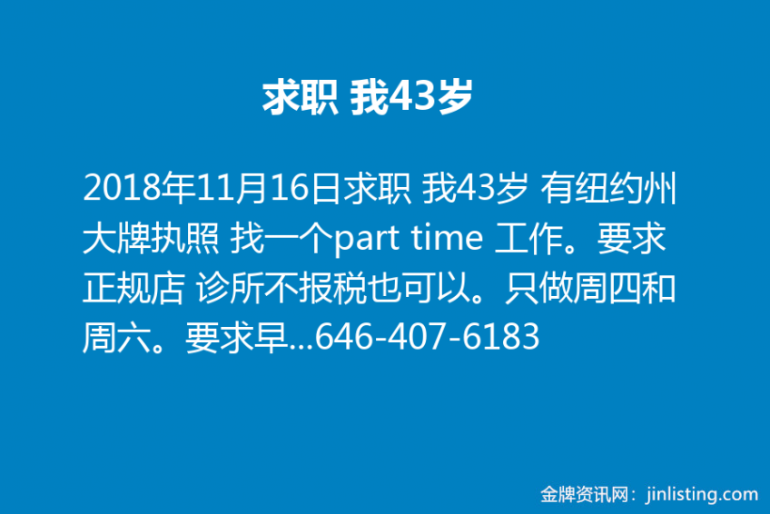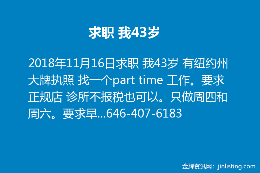求职 我43岁 有纽约州大牌执照 找一个part time 工作。要求正规店 诊所不报税也可以。只做周四和周六。要求早…646-407-6183