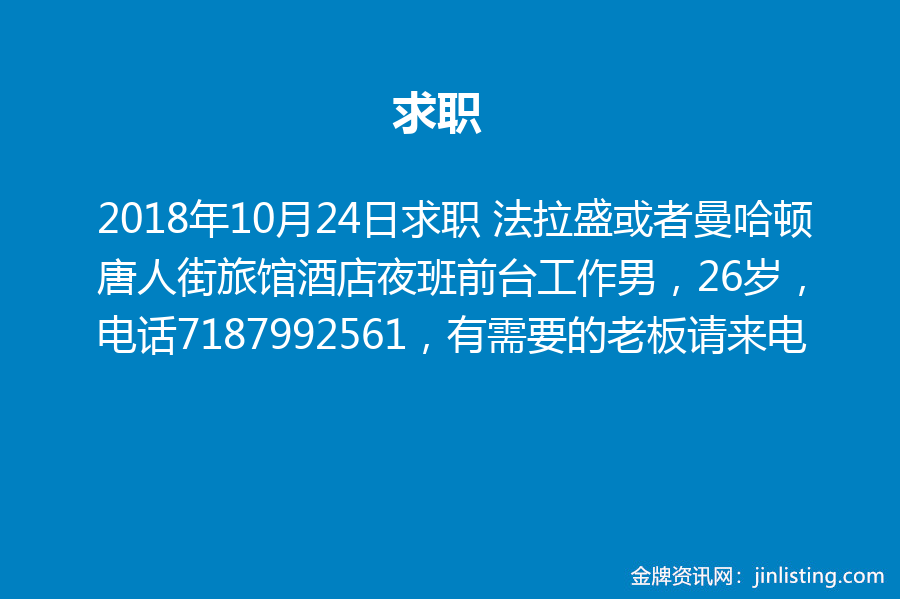 求职 法拉盛或者曼哈顿唐人街旅馆酒店夜班前台工作