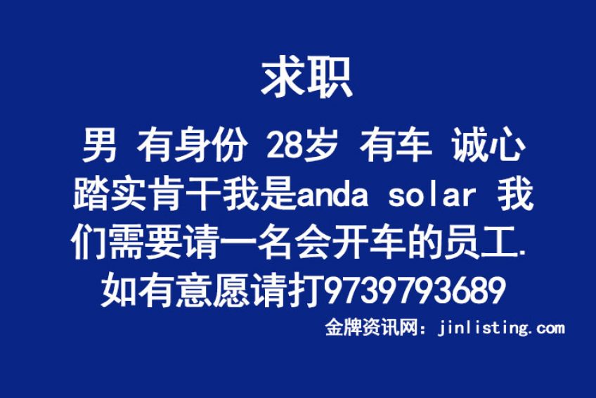 求职 男 有身份 28岁 有车 诚心求职 踏实肯干我是anda solar 我们需要请一名会开车的员工.如有意愿请打9739793689