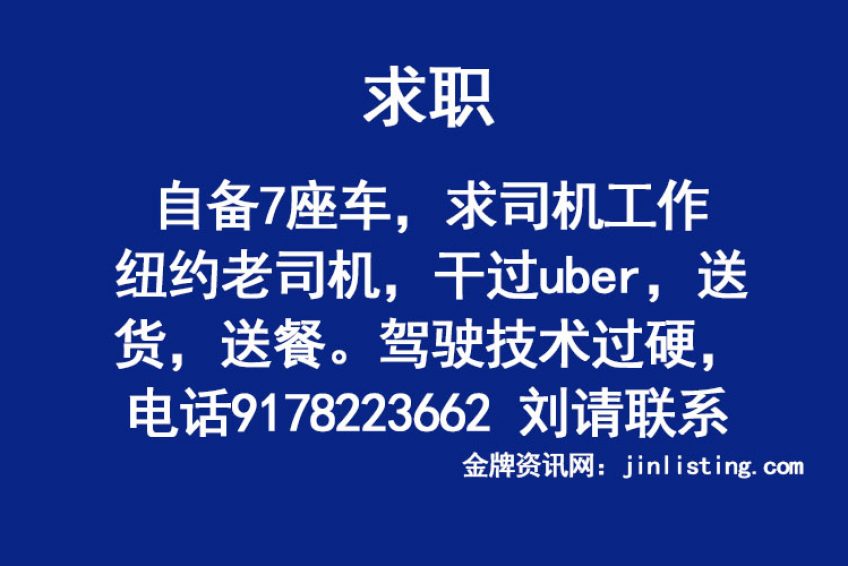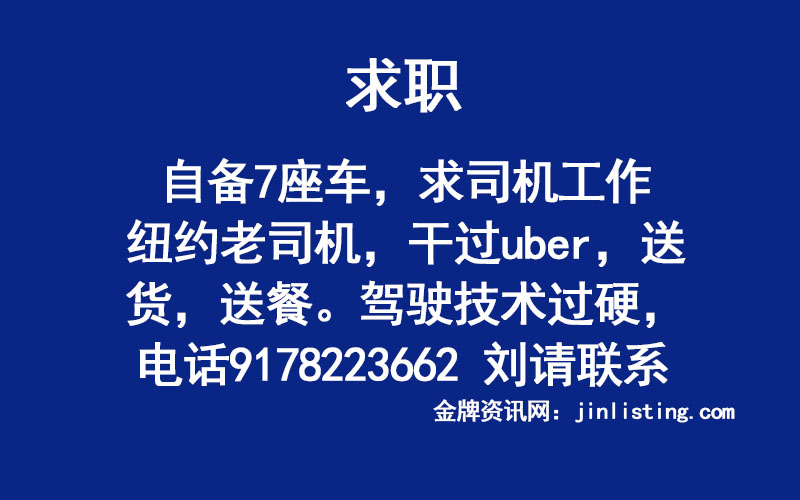 自备7座车,求司机工作 纽约老司机,干过uber,送货,送餐。驾驶技术过硬,电话9178223662 刘请联系