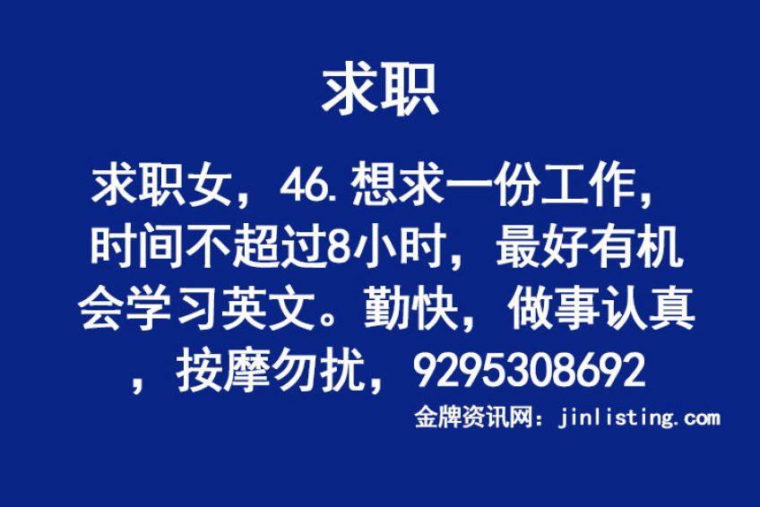 求职 女,46.想求一份工作,时间不超过8小时,最好有机会学习英文。勤快,做事认真,按摩勿扰,9295308692