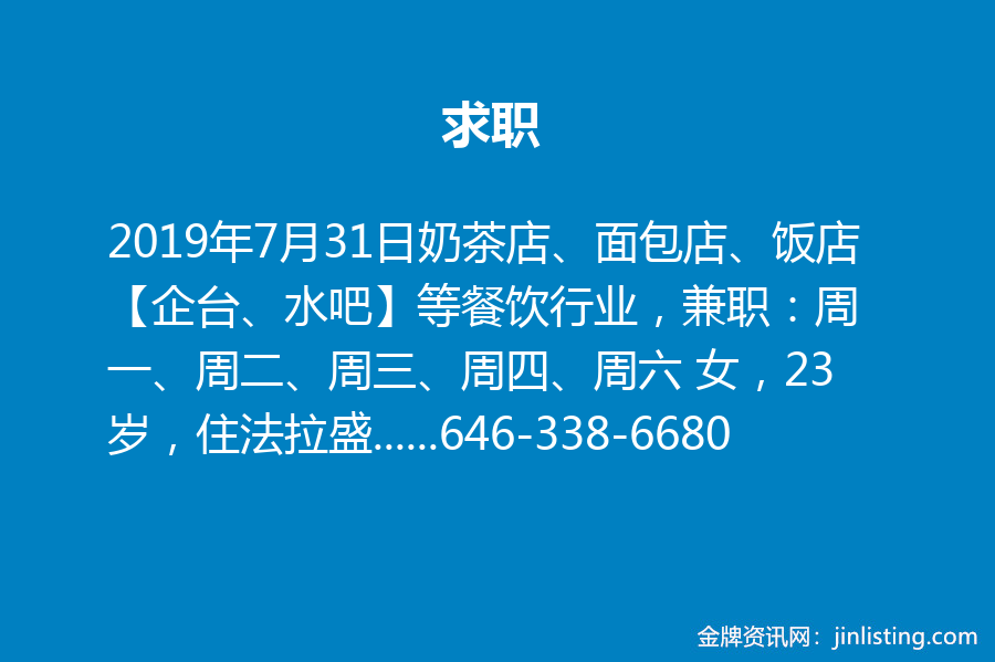 求职:奶茶店、面包店、饭店【企台、水吧】等餐饮行业,兼职:周一、周二、周三、周四、周六 女,23岁,住法拉盛,可报税,会基本英语,善学,做事肯专研、不怕吃苦。需要奶茶店、面包店、饭店【企台、水吧】等餐饮行业,也可以做学徒。 兼职 周一、周二、周三、周四、周六【不是学生】。有意者请电:646-338-6680 【请说明是在大地360上看到的求职信息,谢谢。】