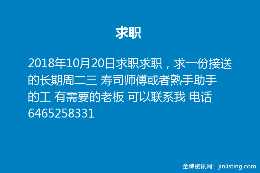 求职求职,求一份接送的长期周二三 寿司师傅或者熟手助手的工 有需要的老板 可以联系我 电话6465258331 打不通…